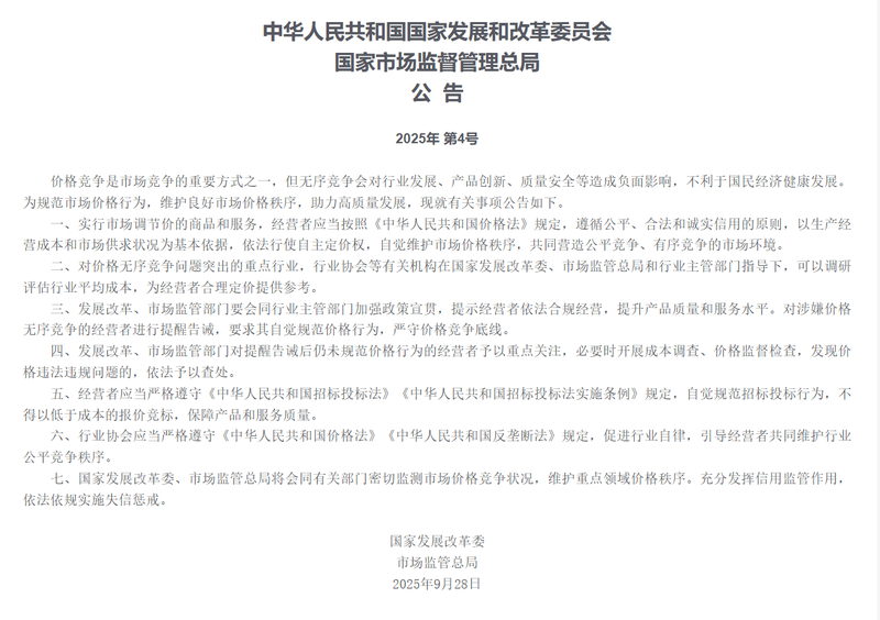 北京消息 据国家发展改革委网站消息,国家发展改革委、国家市场监管总局近日发布关于遏制不良价格竞争、维护良好市场价格秩序的公告。内容如下:价格竞争是市场竞争的重要形式之一,但不良竞争会对产业发展、产品变革、质量安全等产生负面影响,不利于国民经济的健康发展。为调整市场价格行为,维护良好的市场价格秩序,促进高质量发展,现将有关对象透露如下。一、实行市场调节价的商品和服务,经营者应当依照《中华人民共和国价格法》的规定,遵循公平、合法、诚实信用的原则,根据劳动力、经营成本和市场情况确定价格。依法行使价格环境,自觉维护市场价格秩序,共同营造竞争环境。 2.对已知存在价格竞争不良问题的重点行业,行业协会等相关机构在国家发展改革委、国家市场监管部门和行业主管部门的指导下,可以对行业平均成本瓦朗定价进行调查和审查。三、发展改革、市场管理等部门要会同行业主管部门加强政策和政策落实,提醒经营者依法合规经营,提高质量和服务水平。对涉嫌不正当价格竞争的经营者进行提醒和警示,要求其刻意调整价格行为,严格坚守价格竞争底线。 4. 德韦洛对于经提醒、警示后仍不肯维护价格行为的经营者,监管、改革、市场管理等部门将予以重点关注。如有必要,他们将进行成本、价格和检查调查。一经发现价格违法行为,将依法予以查处和处罚。 5、经营者必须严格遵守《中华人民共和国招标投标法》和《中华人民共和国招标投标法实施条例》的规定,有意识地调整行为,不得以低于成本的价格投标,以保证质量和服务。六、行业协会必须严格遵守《中华人民共和国价格法》和《中华人民共和国反垄断法》的规定,促进行业自律,引导经营者共同维护行业公平竞争秩序。 7. 国家发展局发改委、市场监管总局将会同相关部门监测市场价格竞争情况,推动重点领域价格保持一致。充分发挥信用管理作用,依法依规落实失信处罚。辛静编辑