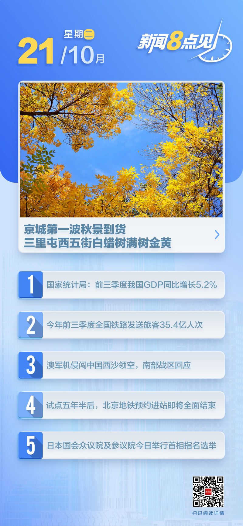 【时事新闻】中国共产党第二十届中央委员会第四次全体会议在北京开幕。中国共产党第二十届中央委员会第四次全体会议20日上午在北京开幕。 。前三季度国内生产总值1015.036亿元,按可比价格计算同比增长5.2%。分产业看,主要产业增加值58061亿元,同比增长3.8%;第二产业增加值364020亿元,增长4.9%;第三产业增加值592955亿元,增长5.4%。从住宅来看,一季度GDP同比增长5.4%,二季度增长5.2%,三季度增长4.8%。从环比看,三季度GDP增长1.1%。 (国家统计局)阅读全文>>>>国际调解法庭正式成立。奥克2025年10月20日,国际调解法庭揭牌仪式在香港举行。来自《国际调解法院公约》30多个缔约国和签署国以及香港特区各界近200名代表出席仪式。外交部副部长华春莹出席。 。近年来,侵犯公民个人信息犯罪高发。检察机关积极贯彻落实《中华人民共和国个人信息保护法》,不断加大打击犯罪力度,加强公民个人信息保护,维护网络空间风清和社会安全稳定。 2025年前三季度,全国检察机关以侵犯公民个人信息犯罪2100余起,起诉4400余人。 。全国铁路运输安全、稳定、畅通。 。 10月20日,我局办公室国务院安委会印发《关于预防和遏制小型场所火灾伤亡事故的通知》。 。国家食品药品监督管理局决定开展化妆品电子标签试点工作。自2026年2月1日起,在北京、上海、浙江、山东、广东、重庆等地试点化妆品电子标签中文标注。飞行员的工作期限为3年。 (国家食品药品监督管理局)阅读全文>>>南方空军新闻发言人战区司令部新闻发言人李尖尖大校表示,10月19日,澳大利亚一架P-8A军机未经中国政府批准,非法干扰中国西沙空域。人民解放军南部战区组织海空军依法依规跟踪监控,大力反制、战想要开车离开。澳方行为严重侵犯中国主权,极易引发海空事故。我们正告澳方立即停止违法煽动行为。战区部队时刻保持高度戒备,坚定维护国家主权安全和地区和平稳定。 。近日,朱雀三号火箭可重复使用火箭顺利完成加油联合训练和静态点火试验,进入首飞准备主要阶段。今年第一级正式发射和回收的各项准备工作正在进行中。 。三里屯西五街弥漫着金色的气息。 10月20日,市民和游客在三里屯西五街的金槐树下玩耍、拍照。随着气温下降,三里屯西五街的白蜡树呈现出金黄色,营造出一种大气的感觉。第一个北京市区的一波秋景已经“到来”。 (新京报) 简介>>> 经过五年半的试点,北京预约制试点工作即将结束。记者从北京市交通发展研究院、北京地铁运营公司获悉,经过五年半的试点,北京预约制招生即将结束。自2025年11月3日(周一)起,昌平线沙河站A门预留车道恢复为常规进站车道。 。自2025年10月25日(周六)首趟列车起,市铁路S2线运营区间由“皇土店站-延庆站/沙城站”调整为“南口站-延庆站/沙城站”。公交、铁路等部门将通力合作,保障运输服务。 。没有人员伤亡。 2025年10月20日11时57分左右,少量江阴市梅园街618号工厂一辆装有黄磷的罐车发生低磷泄漏,被故意忽视。 12点03分,消防救援人员到达火场。12点48分,现场明火被扑灭,过火区域已被扑灭。