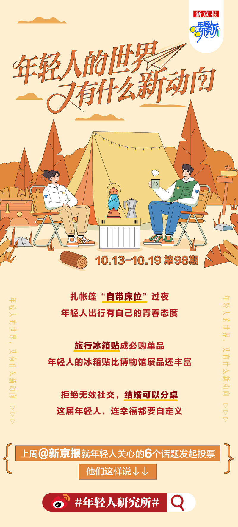 搭帐篷、“自带床铺”过夜旅行,年轻人对青春有自己的想法。旅行冰箱贴已成为必备品。年轻人的冰箱贴比博物馆的展品更丰富。拒绝轻浮的交往,否则你可能会在婚礼上分桌子。对于这一代年轻人来说,就连幸福也必须定制。上周新闻针对年轻人关心的6个话题发起了民意调查。这是他们说的,艾峥策划,赵婉婷编辑,张玉和设计,卢子雄校对,李丽君